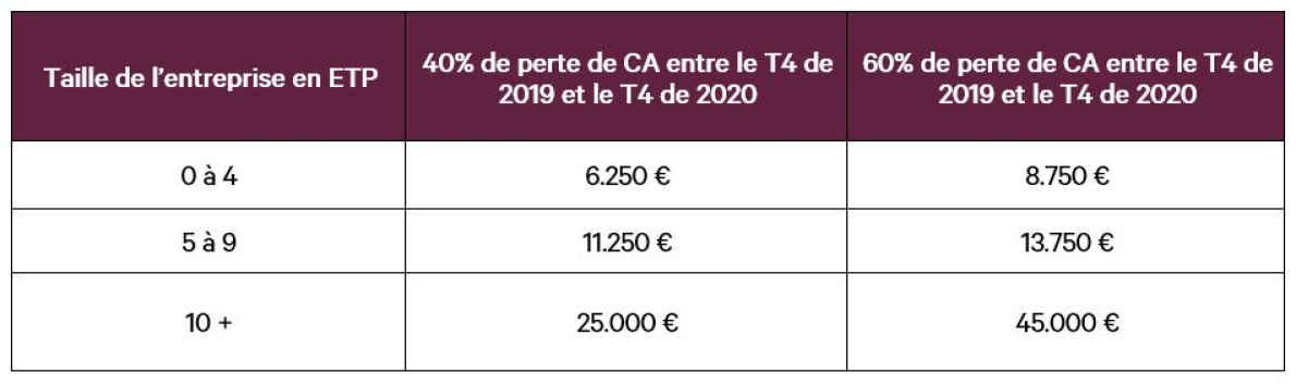 Concrètement, ce dispositif d’aide prendra la forme d’une prime variable dont le montant sera fixé en fonction du nombre d’équivalents temps plein (ETP) de l’entreprise et de la baisse du chiffre d’affaires constatée entre le chiffre d'affaires du dernier trimestre de 2019 et celui du dernier trimestre de 2020. Les entreprises auront accès à la prime à partir d’une perte de CA de 40% entre ces deux périodes. Celles qui ont perdu plus de 60% de CA bénéficieront d’un montant majoré.