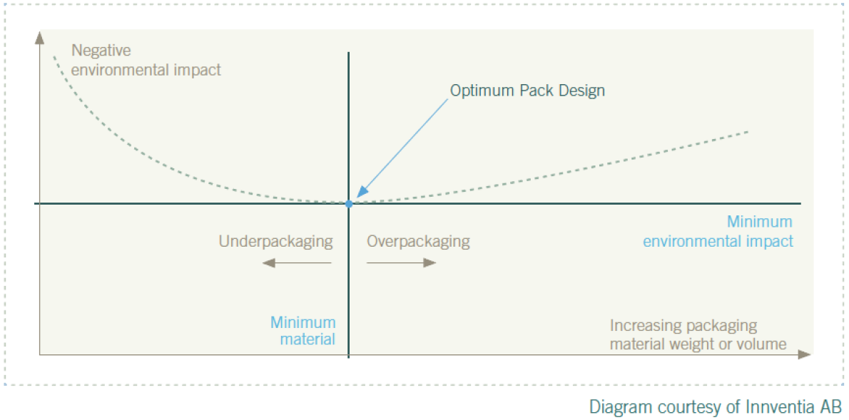 Les nombreuses fonctions d’un emballage ne sont évidemment pas une raison pour en utiliser trop. Et soyons réalistes, utiliser des emballages totalement inutiles n’apporte pas d’avantage économique pour l’entreprise, bien au contraire. Mais emballer trop peu a également des inconvénients : les produits restent frais moins longtemps ou sont abîmés. Il faut donc trouver l’emballage optimal et ce, par type de produit : pas trop, ni trop peu. Le Modèle AB d’Innventia (cf. schéma) en est une bonne illustration. Par ailleurs, chaque décision doit être bien réfléchie : faut-il utiliser un matériaux ou une combinaison de matériaux, faut-il un emballage avec un système de barrière , faut-il ajouter des additifs fonctionnels, etc. La conception de l’emballage optimal est un exercice complexe puisque les producteurs doivent tenir compte d’éléments très divers. Pensez à la sécurité alimentaire, la fonctionnalité, les chaînes logistiques, la visibilité, la sensibilité à l’impact environnemental ou aux déchets sauvages. La protection du produit reste cependant le critère le plus important.