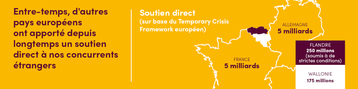 Dix-sept États membres ont déjà activé le Temporary Crisis Framework mis en place par la Commission européenne. Dans notre pays, la Flandre et la Wallonie ont annoncé des mesures de soutien direct sous la forme de subventions pour les entreprises les plus impactées, bien que de manière beaucoup plus limitée et, en Flandre, à des conditions plus strictes que, par exemple, en France et en Allemagne. Comme dans d’autres États membres, la Flandre et la Wallonie libèrent également des fonds pour des prêts et des garanties (1 milliard d'euros et 300 millions d'euros respectivement) pour les entreprises ayant des problèmes de liquidités.