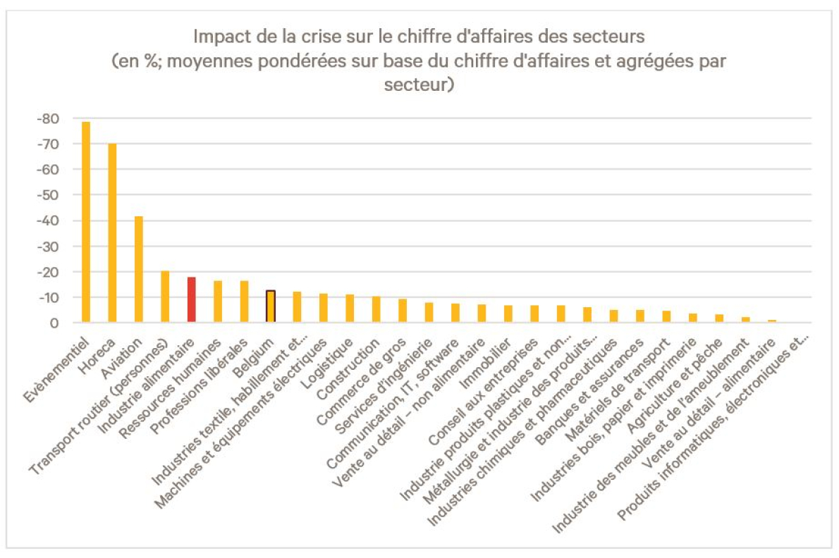 L’industrie alimentaire est d’ailleurs, dans cette dernière enquête, le cinquième secteur le plus touché, directement après l’évènementiel et les activités récréatifs, l’horeca, l’aviation et le transport routier de personnes.