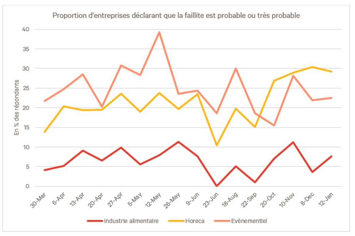 Un motif d’inquiétude est le risque de faillite. Pas directement dans l’industrie alimentaire, puisque là la proportion d’entreprises risquant la faillite reste relativement stable et à un niveau plutôt faible. Mais indirectement, en tant que fournisseur du secteur de l’horeca et de l’évènementiel dans lesquels la proportion estimée de faillites se situe aux alentours des 30% et 25% respectivement !