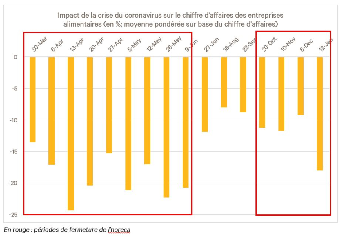 La perte de chiffre d’affaires de l’industrie alimentaire attendue pour l’ensemble de l’année 2021 est de 9%, un peu mieux que ce qui était annoncé lors de l’enquête de décembre (11%). Comme le note la BNB : « Malgré le développement très rapide de divers vaccins, la campagne de vaccination demandera du temps. Il devient donc de plus en plus évident que la situation sanitaire en Belgique et à l'étranger ainsi que les mesures restrictives continueront de peser sur le chiffre d'affaires des entreprises pendant encore un certain temps. »