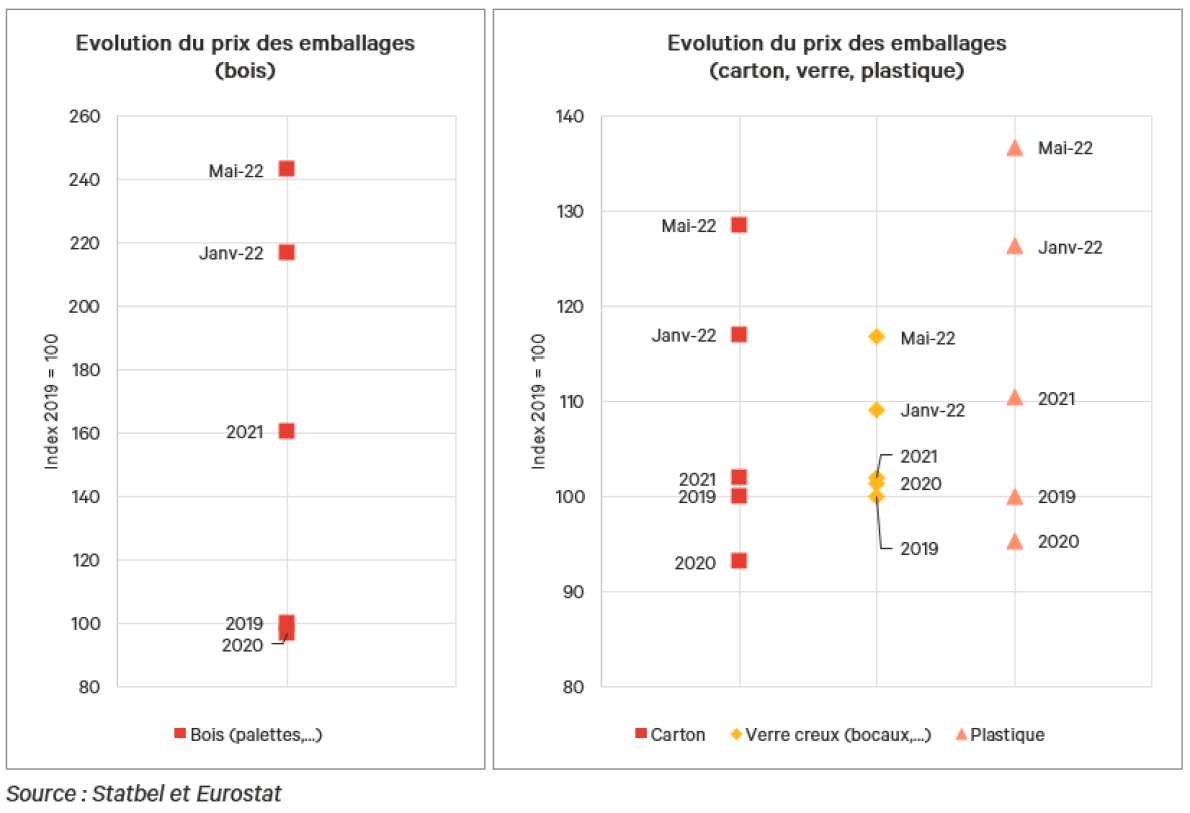 Les prix des matières premières, de l’énergie et du transport restent à des niveaux exceptionnellement élevés. Et s’il y a bien un poste pour lequel les dépenses continuent de grimper, c’est celui des emballages. Ainsi, entre mai et août 2021, les prix des contenants en bois (par exemple, les palettes en bois) avaient déjà plus que doublé. Et alors que l’on pensait avoir atteint un plafond depuis, les prix sont repartis à la hausse en mai (+10,1 %). En ce qui concerne les emballages en carton, les prix ont connu une augmentation de 34 % sur un an ; les emballages en plastique 29 %. Enfin, les prix des emballages en verre ont augmenté de 13 % sur les 5 derniers mois uniquement. Etant donné les (risques de) pénuries, cette hyper-inflation ne risque pas de s’arrêter à court terme.