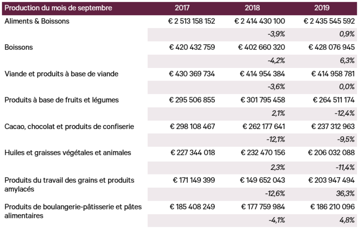 En extrapolant les chiffres de la production industrielle pour le mois de septembre (source : Statbel), l’industrie alimentaire semble s’orienter vers une légère reprise de l’activité en 2019, après une année 2018 plutôt difficile. En effet, l’industrie alimentaire enregistre dans son ensemble une hausse modérée de la production d’un peu moins de 1% en septembre 2019 par rapport au même mois il y a un an. Derrière ce chiffre se cache néanmoins des réalités différentes selon les secteurs.