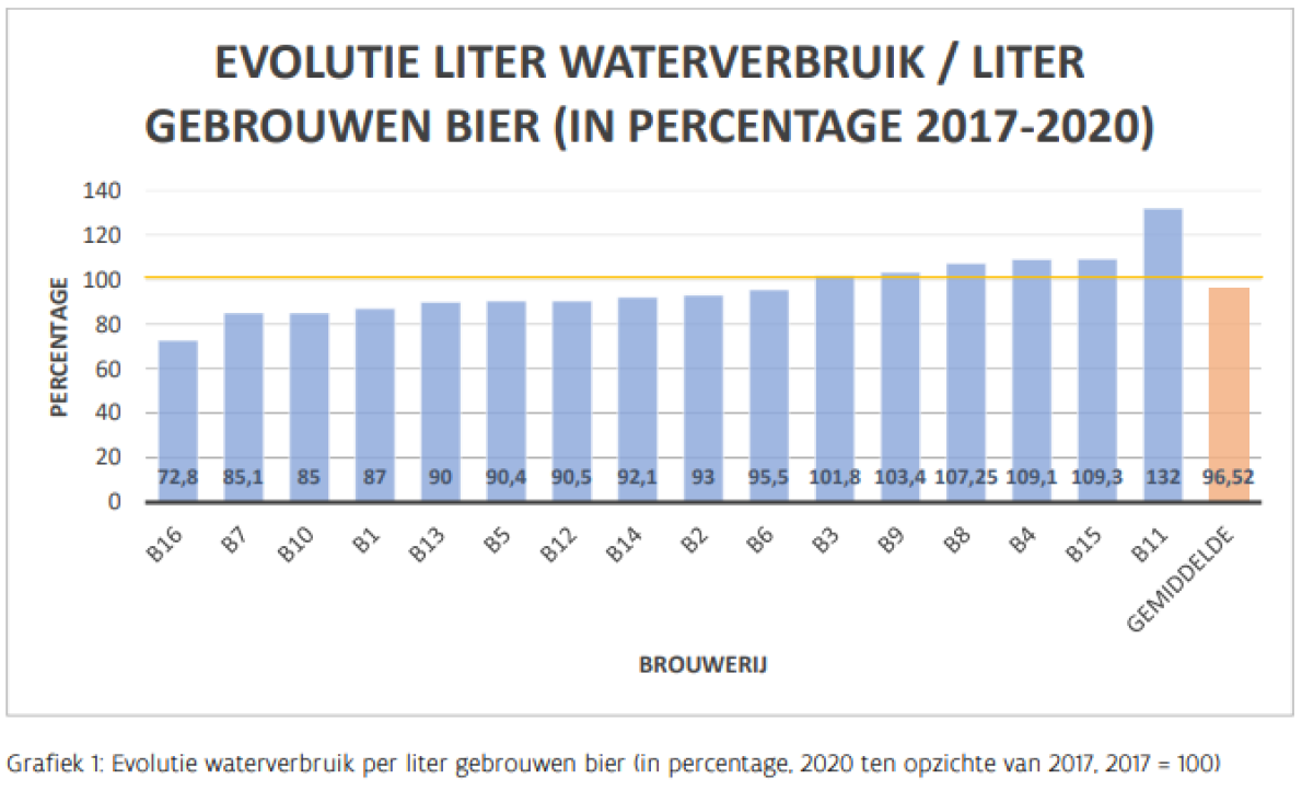 Enerzijds zijn de productievolumes teruggevallen waardoor er verhoudingsgewijs vaak meer water moest gebruikt worden per liter bier (vb. relatief gezien meer reinigingswater nodig). Anderzijds zorgde de sluiting van de horeca ook voor een wijziging in de productmix. Door relatief meer af te vullen op kleinere flessen en blikken dan op vaten, was er opnieuw relatief meer reinigingswater nodig.