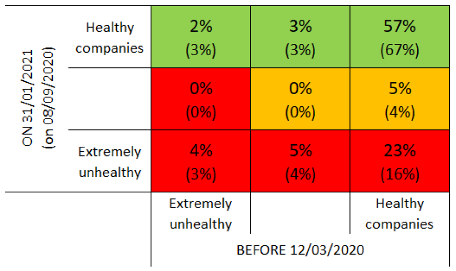• à droite, les entreprises qui affichaient une santé moyenne à très bonne au 12 mars 2020 (85%).