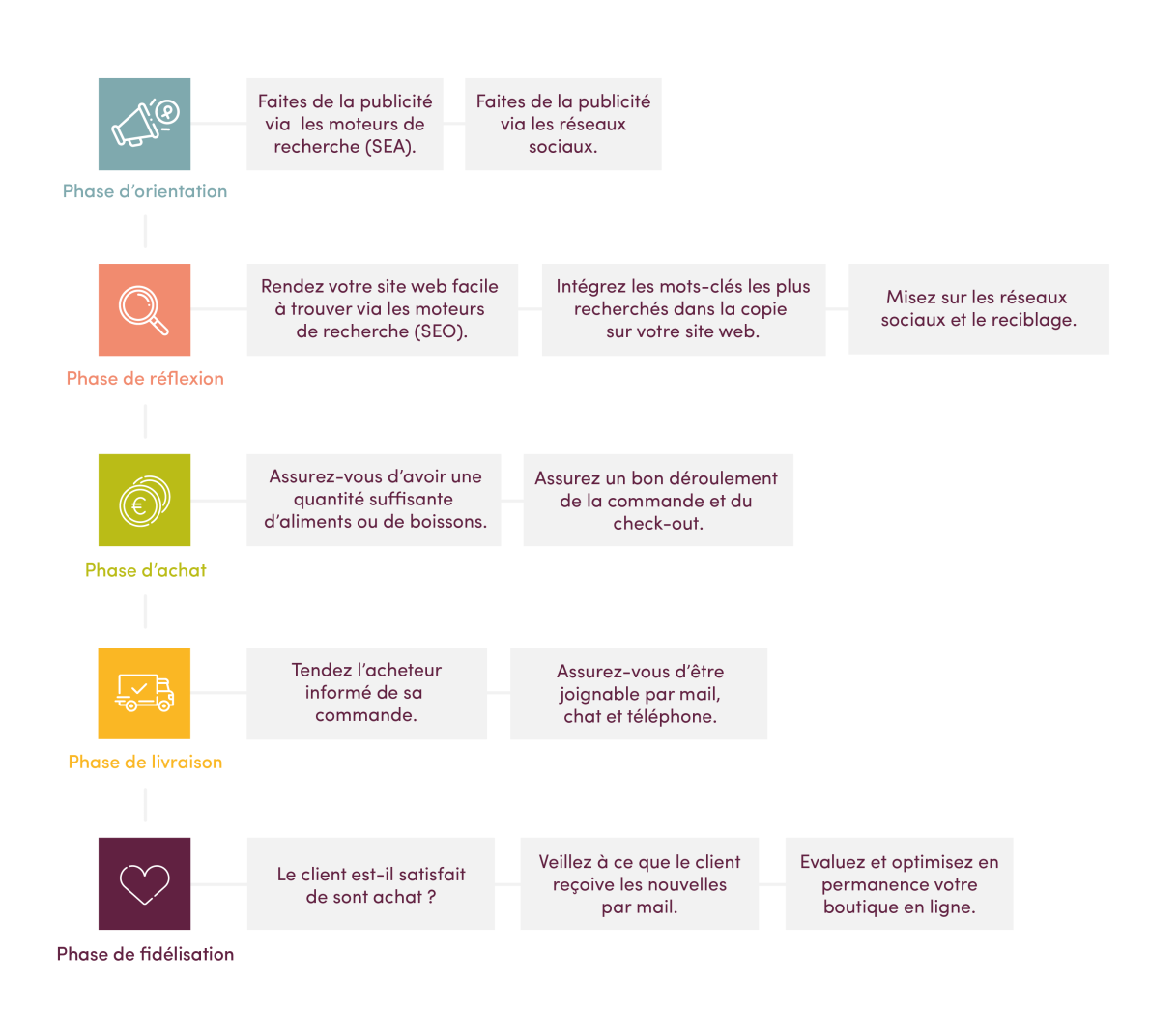 Un « customer journey » est le parcours que quelqu’un doit suivre lors de l’achat d’un produit ou service. Avec ce modèle, vous savez comment un client potentiel se déplace numériquement.Vous pouvez donc y répondre. Un customer journey comporte 5 phases : l’orientation, la considération, l’achat, la livraison et la fidélisation.