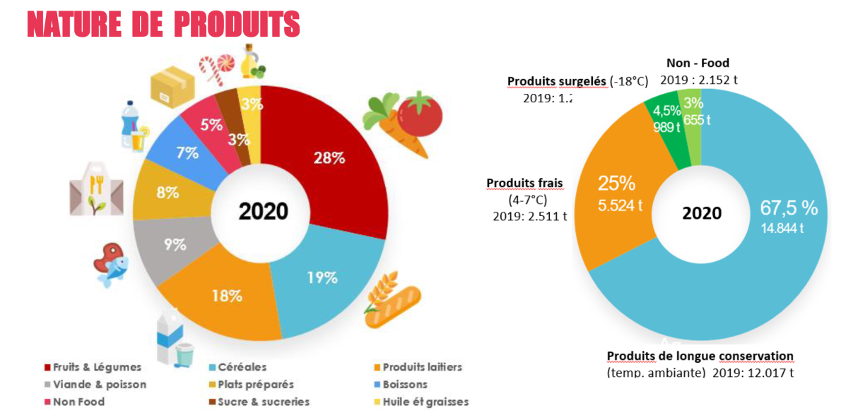 La forte augmentation des dons l'année dernière s’explique, en partie, par l'accroissement du volume de marchandises provenant de l'industrie alimentaire, soit l'équivalent de 6 000 tonnes l’an passé. La part du secteur de la distribution a légèrement diminué en raison d'une forte baisse des excédents alimentaires durant la première vague du coronavirus, suite à la frénésie de stockage. »