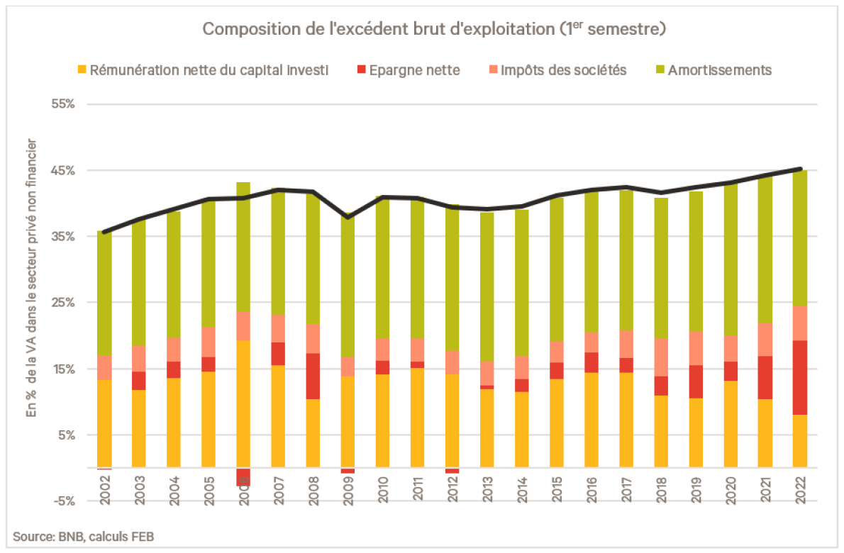 Faux ! Premièrement, l’indicateur mis en avant par la BNB est le taux de marge brut. Il mesure le pourcentage de la valeur ajoutée (VA) conservé par les sociétés, après paiement des salaires aux travailleurs et des impôts nets des subventions sur la production, mais avant déduction des amortissements en capital. Il n’est donc pas indépendant des investissements qui ont été réalisés. En d’autres termes, si une entreprise a investi et a donc des amortissements en capital plus importants, le taux de marge brut augmentera également (toutes choses égales par ailleurs).