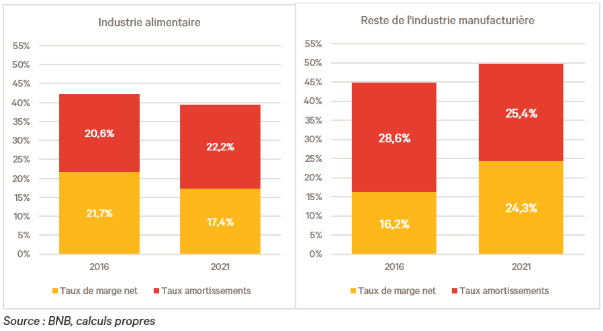 Il est cependant intéressant de noter que, dans l’industrie alimentaire, la part des amortissements dans la valeur ajoutée a gagné en importance ces dernières années. Cela signifie donc que l’industrie alimentaire (a) fait preuve d’une politique d’investissement volontariste.