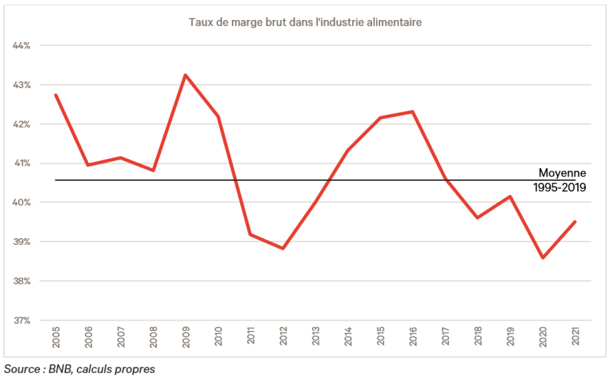 Premièrement, en reprenant le taux de marge brut mis en évidence par la BNB, on constate que celui-ci affiche effectivement une progression en 2021 par rapport à 2020 (39,5% contre 38,6%). Cependant, il est encore nettement en-dessous de son niveau pre-covid (40,2%) et de sa moyenne de long terme (40,6% sur la période 1995-2019).