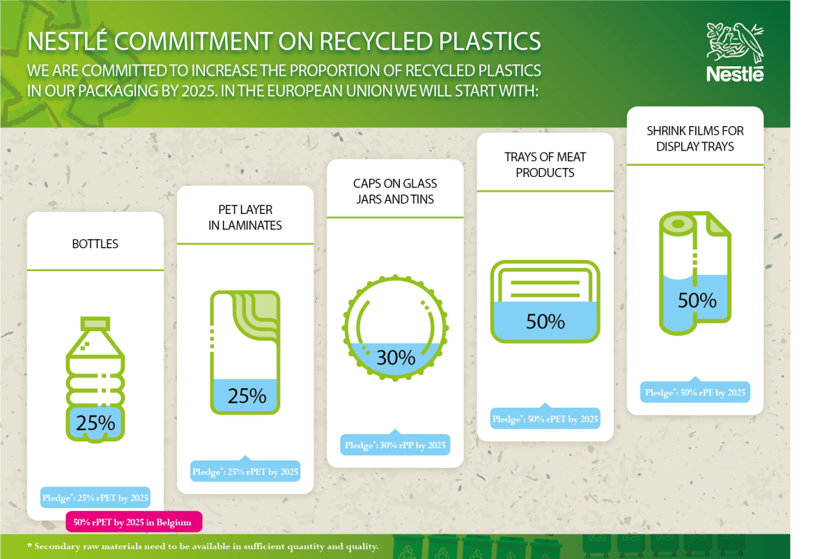 En septembre 2018, Nestlé s’est engagée à augmenter considérablement la quantité de plastiques recyclés qu’elle utilise dans certains de ses emballages dans l’Union européenne.