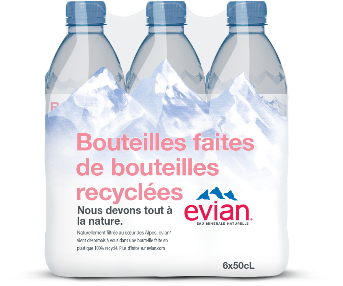 Danone s’engage à n’utiliser que des emballages circulaires d’ici 2025. C'est pourquoi evian® accélère sa transition vers une économie circulaire : depuis 2020, tous nos petits formats, les plus consommés en dehors de la maison, sont désormais composés à 100% de matériaux recyclés. evian® fait ainsi un grand pas vers des emballages durables. Les bouteilles faites entièrement à partir de bouteilles recyclées permettent de ne pas devoir utiliser de nouvelles matières vierges, prélevées dans la nature.