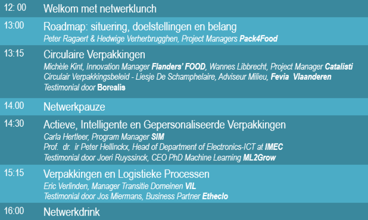Het project kwam tot stand in een samenwerkingsverband tussen Pack4Food en de vier belangrijkste speerpuntclusters in België: Flanders’FOOD (voeding), VIL (logistiek), Catalisti (chemie en kunststoffen) en SIM (materialen). Universiteiten, diverse organisaties (waaronder Fost Plus, OVAM en Fevia) en een 50 tal bedrijven over de hele keten heen gaven hun input voor de opmaak van deze roadmap.