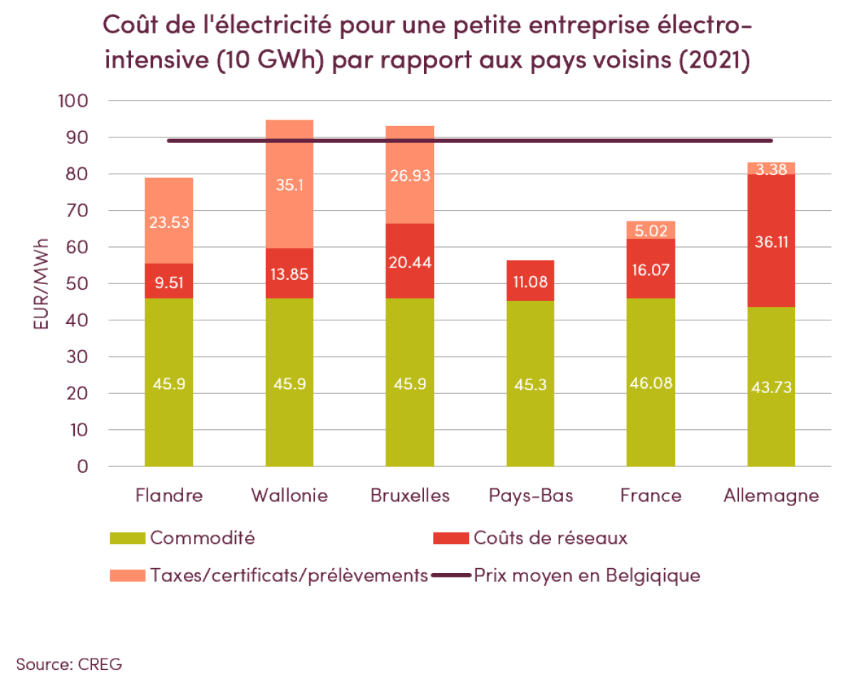 Les petites entreprises alimentaires belges à forte consommation électrique paient en moyenne leur électricité de 7 %, 33 % et 58 % plus chère que leurs homologues en Allemagne, en France et aux Pays-Bas respectivement. Avec des taxes 7 fois plus élevées que dans nos 3 pays voisins, la facture d’électricité finale est au moins 30 % plus chère en Belgique.