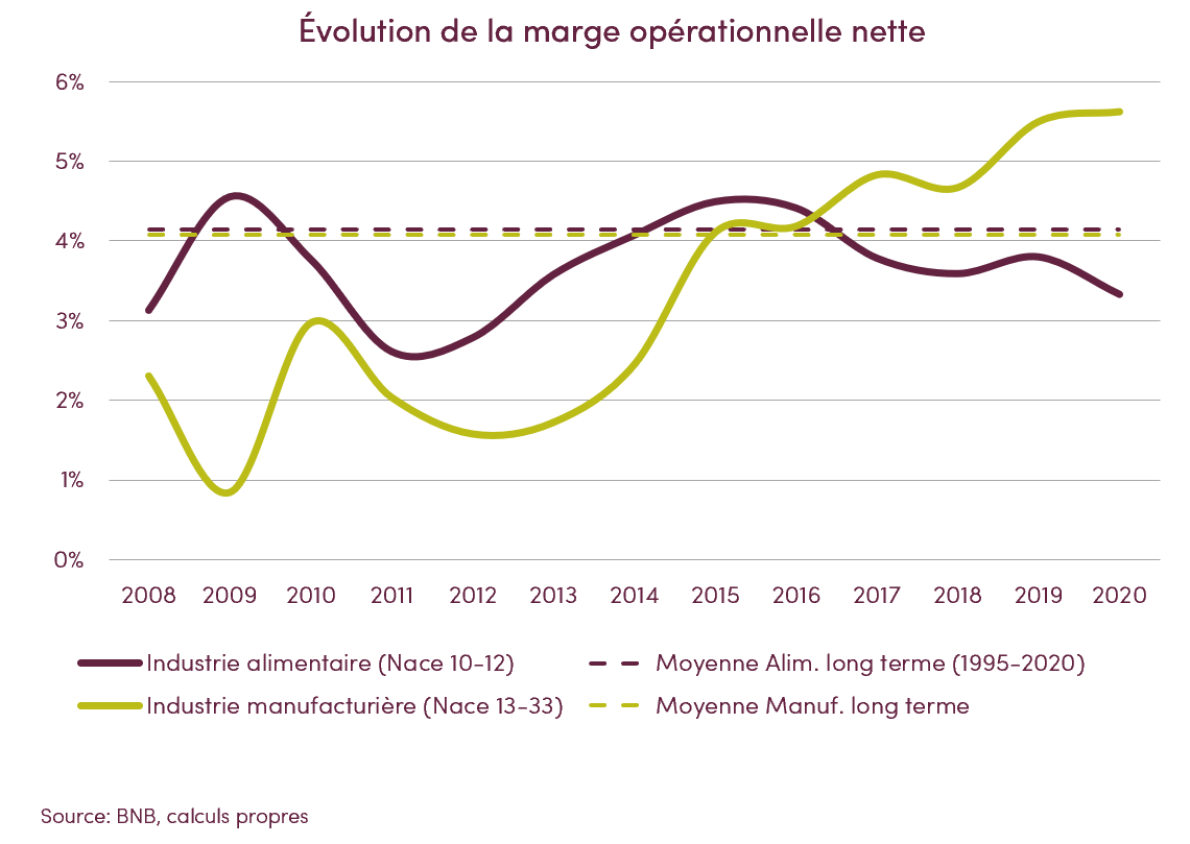 Depuis 2017, la marge opérationnelle nette de l’industrie alimentaire est passé sous le niveau moyen de long terme, après être repassé au-dessus de ce niveau en 2015 et 2016.