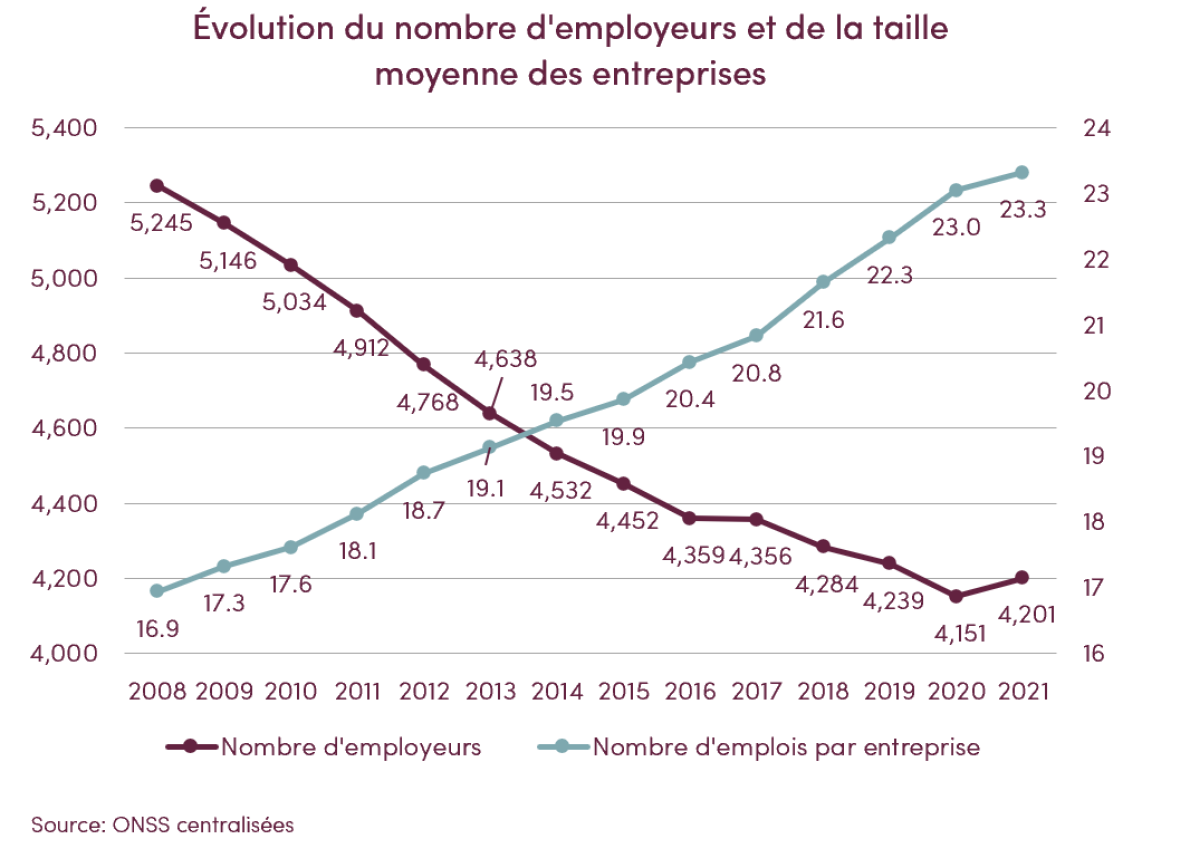 En 2021, l’industrie alimentaire comptait 4 201 employeurs, dont 2 308 boulangers artisanaux. L’industrie alimentaire représente 27,7% des employeurs de l’industrie manufacturière. Cette part élevée découle du fait que l’industrie alimentaire compte relativement plus de PME que le secteur industriel moyen.