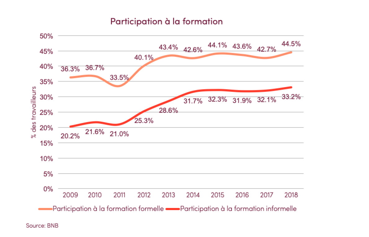 Dans l’industrie alimentaire, près d’un travailleur sur deux a suivi une formation formelle en 2018. Pour la formation informelle, il s’agit d’un travailleur sur trois. Cette proportion progresse légèrement au fil des ans.