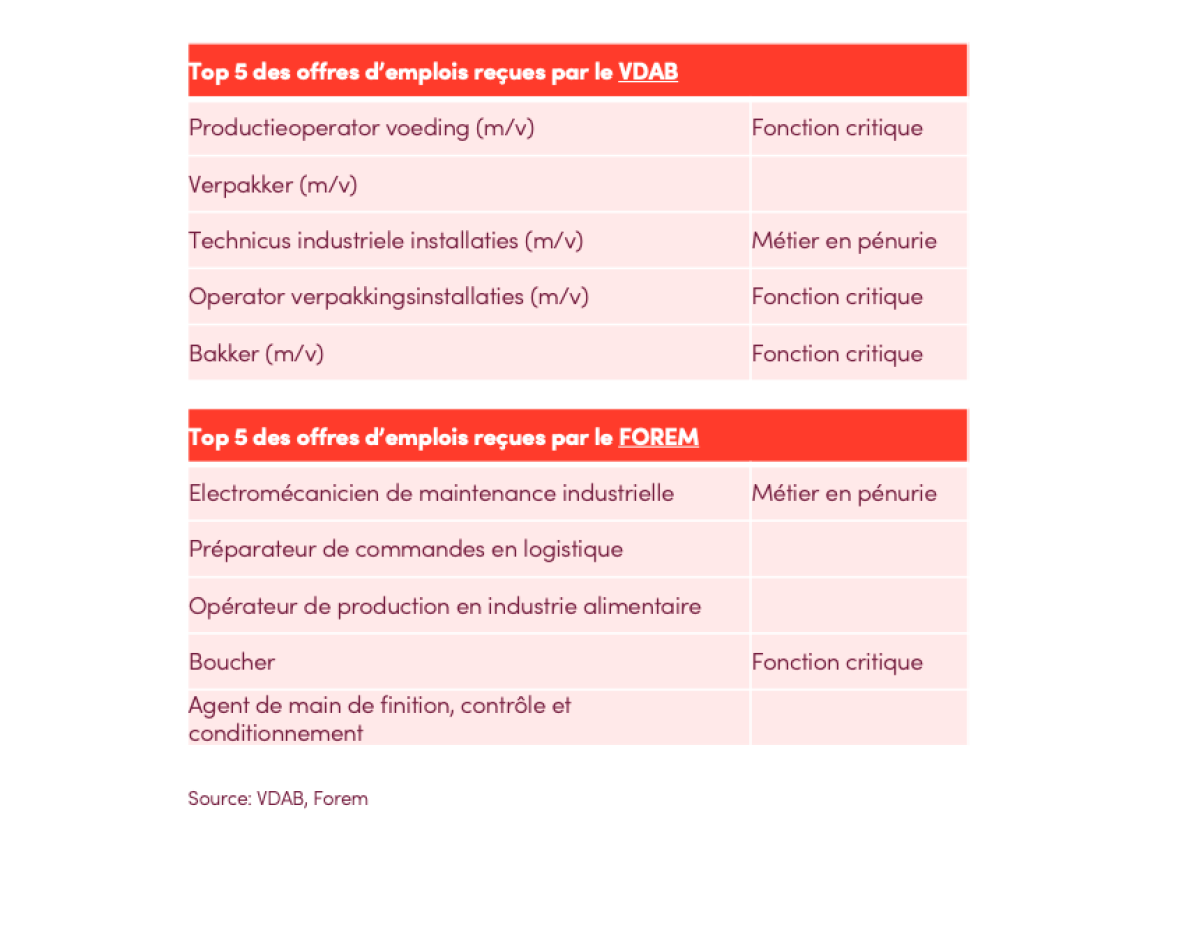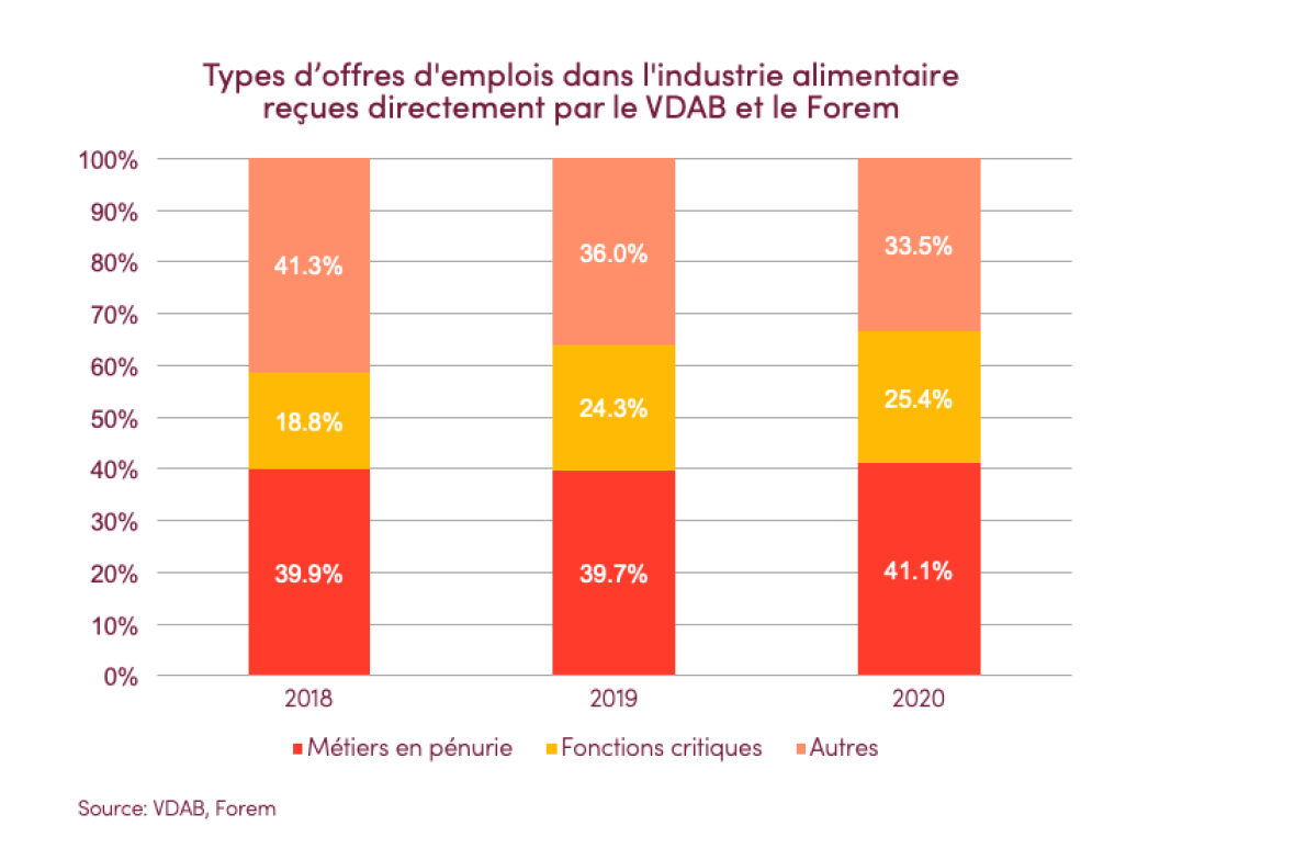 Les postes vacants concernent principalement des profils techniques, tels que des opérateurs de production en industrie alimentaire, des techniciens d’installations industrielles et des électromécaniciens de maintenance industrielle. Outre ces profils industriels généraux particulièrement difficiles à trouver, certains profils spécifiques au secteur alimentaire, comme les bouchers, en Wallonie ou les boulangers en Flandre, le sont également. Le conditionnement et la logistique sont aussi des profils forts demandés dans l’industrie alimentaire.