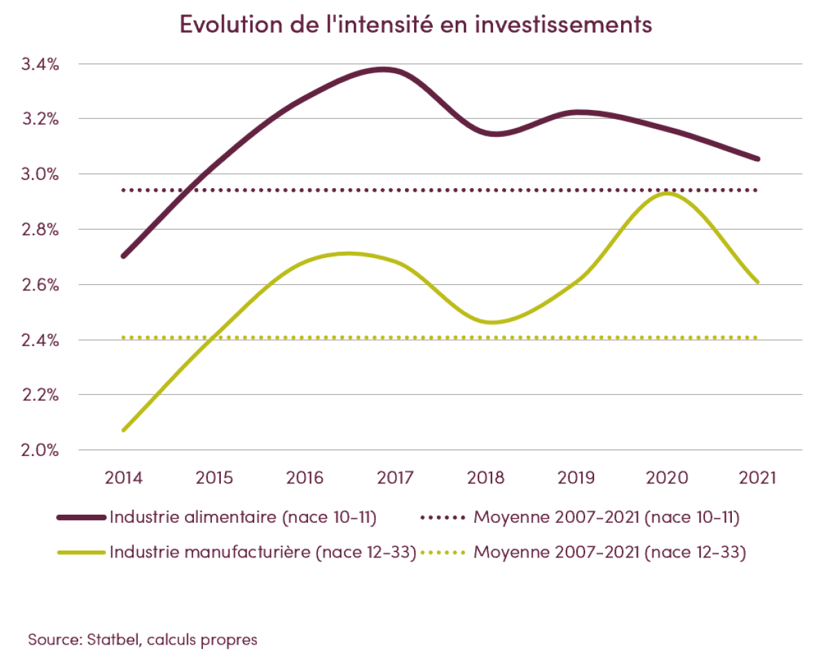 Ces dernières années, l’industrie alimentaire a investi une part de son chiffre d’affaires relativement plus élevée que l’industrie manufacturière. L’intensité d’investissement moyenne de ces 15 dernières années est même un demi-point de pourcentage plus élevée que pour l’industrie manufacturière.