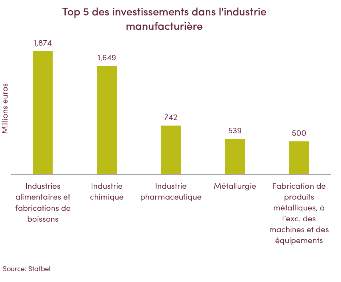 L’industrie alimentaire, en ce compris la fabrication de boissons, est toujours le premier secteur de l’industrie manufacturière en ce qui concerne les investissements., devant la chimie et l’industrie pharmaceutique. Son avance a cependant quelque peu fondu suite à la forte augmentation des investissements dans l’industrie chimique (+30 % entre 2021 et 2019).