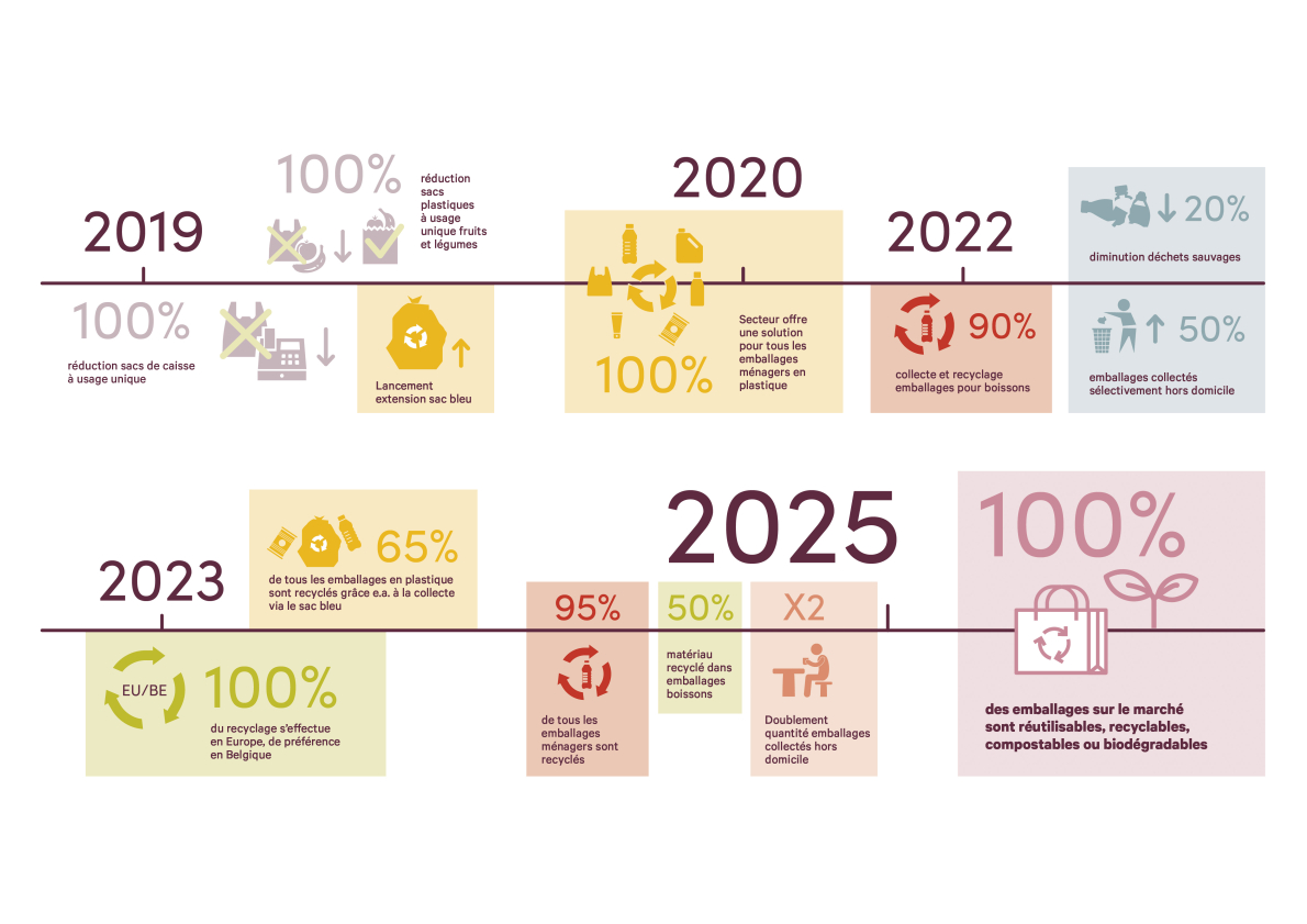 Dans les engagements en matière d’emballages que Fevia a pris avec les partenaires de la chaîne en 2018 avec le gouvernement flamand, il est mentionné, entre autres, que nous voulons collecter et recycler 90 % des emballages de boissons d’ici 2022. Nous rappelons notre engagement à atteindre les 6 objectifs sur www.emballages2025.be et à investir dans des initiatives qui rendent cela possible.