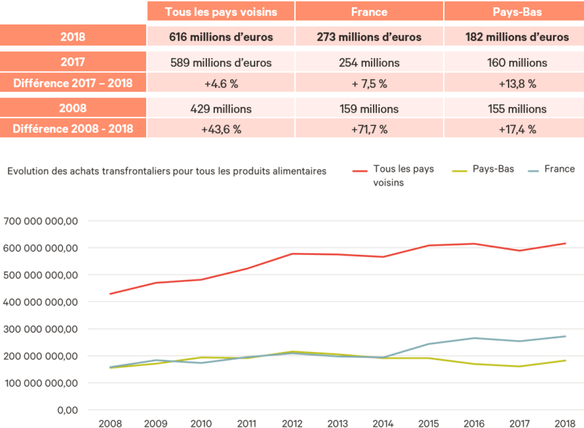 L’analyse du comportement d’achat de 5000 Belges réalisé par GfK ne fait aucun doute : les Belges sont de plus en plus amenés à acheter leurs produits alimentaires et leurs boissons dans nos pays voisins. Après une légère retombée suite aux contrôles frontaliers renforcés après les attentats en 2017, les distributeurs français poussent à nouveaux les Belges à traverser la frontière. Cette augmentation est moins soutenue aux Pays-Bas, probablement parce que les distributeurs néerlandais se sont installés dans notre pays ces dernières années et que les Pays-Bas ont augmenté la TVA au même niveau que notre pays.