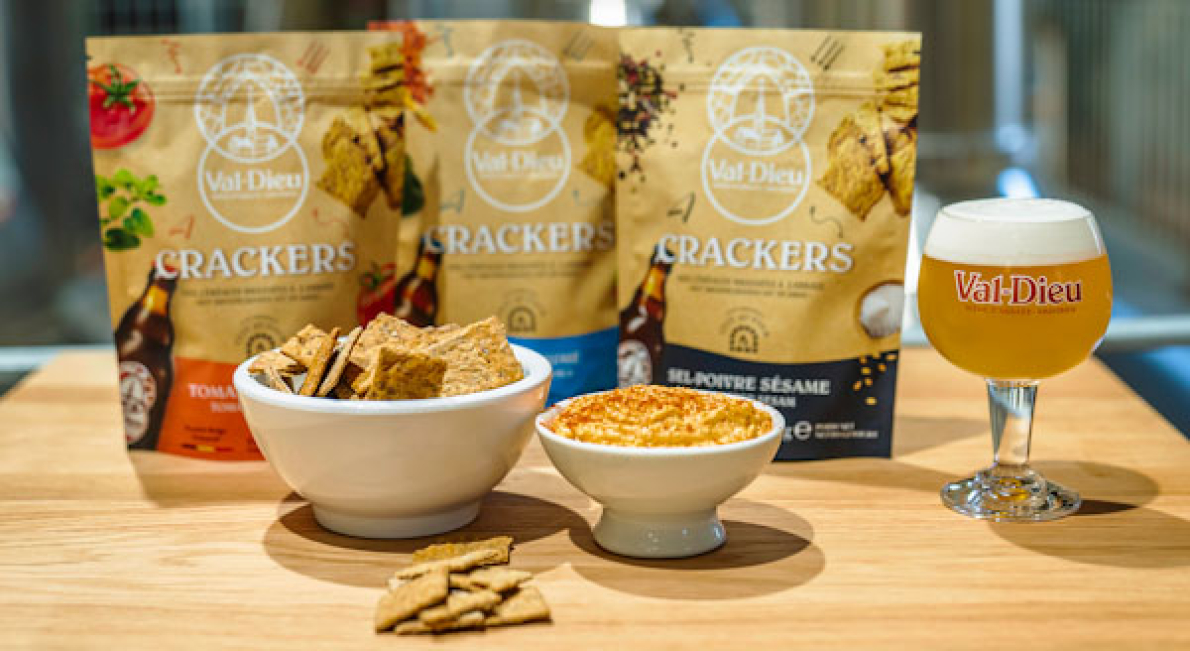 Bij een biertje hoort uiteraard een versnapering. En liefst een versnapering die evenwichtig is en goed voor het milieu. Onlangs lanceerde Val-Dieu als eerste Belgische brouwer een nieuwe productinnovatie: crackers op basis van bierdraf, een restproduct bij het brouwen van bier.