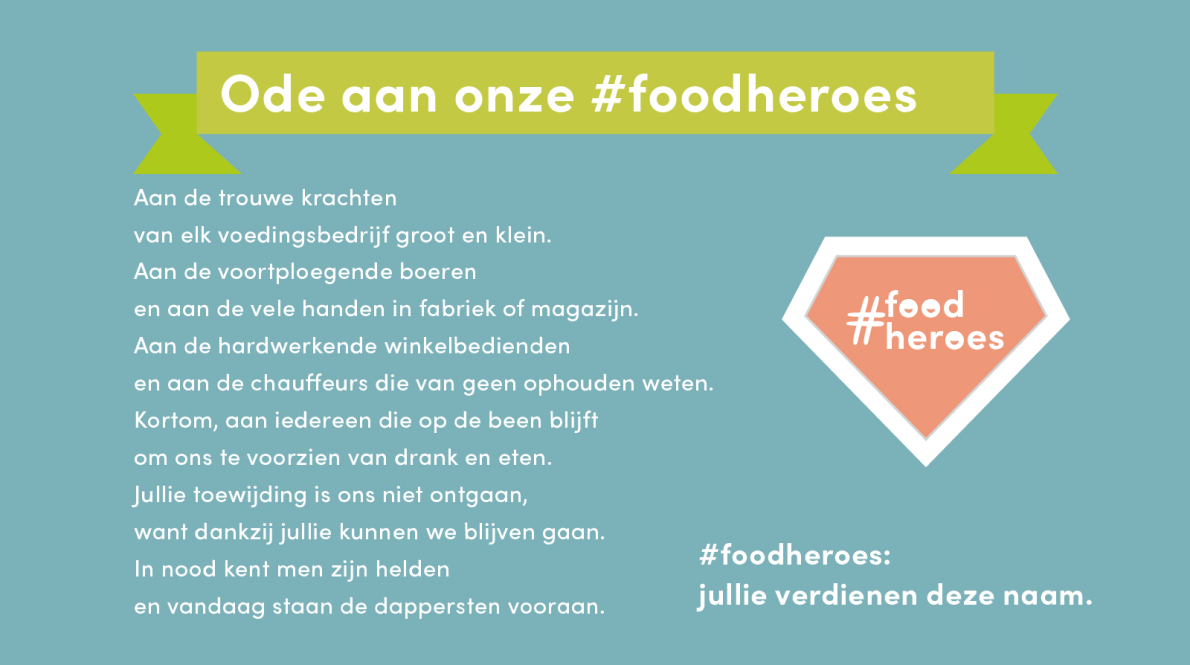 Sinds het uitbreken van de coronapandemie staan heel wat van onze bestaande zekerheden plots op losse schroeven. Maar zelfs in het midden van deze crisis blijven we met z’n allen eten en drinken. Voor velen biedt een lekkere maaltijd nu meer dan ooit een moment van rust, van troost, van samen genieten… Laten we goed beseffen dat we dat te danken hebben aan heel wat helden die op het veld, in de voedingsfabrieken en in de winkels onze voedselbevoorrading blijven garanderen. Om die #FoodHeroes collectief een hart onder de riem te steken, lanceerden we een oproep… waarop massaal veel reactie kwam!