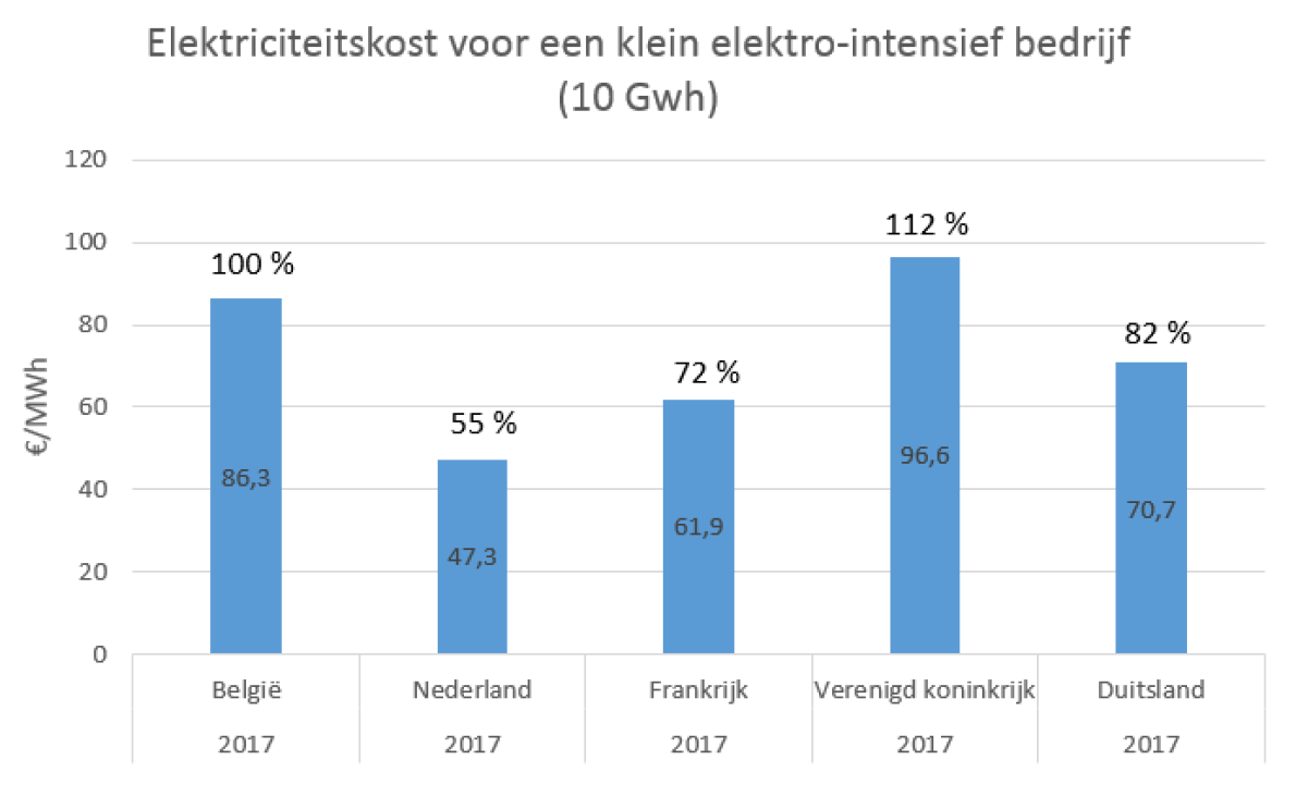 De kleine Belgische elektro-intensieve voedingsbedrijven die 10 Gwh verbruiken betalen hun elektriciteit tussen 18 en 45 % duurder in België vergeleken met Frankrijk, Nederland en Duitsland. Enkel in het Verenigd Koninkrijk zou een gelijkaardig bedrijf zijn verbruik iets duurder betalen.