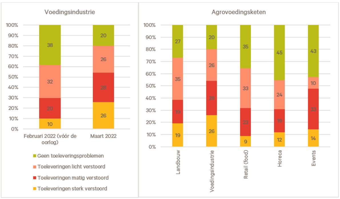 Het aandeel van de respondenten uit de voedingsindustrie dat melding maakt van “ernstige” bevoorradingsproblemen is gestegen van 10% voor de oorlog in Oekraïne tot 26% in maart (linkse grafiek). En slechts 20% ondervindt geen verstoring van de bevoorrading (vergeleken met 38% voor de oorlog).