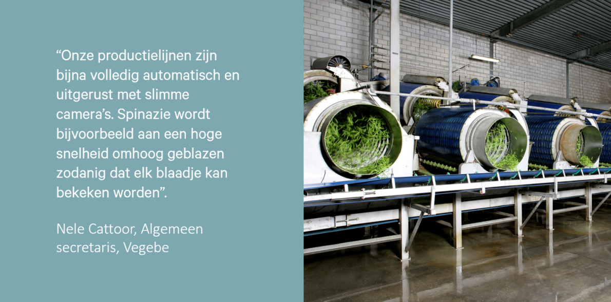 “De sector van groenteverwerkers is enorm innovatief. Dan spreek ik niet enkel van de producten die op de markt komen, zoals nieuwe mengelingen van groentjes of innovaties zoals stukjes rode biet die je kan bakken als spek. Er is ook veel innovatie in de productie zelf. Onze productielijnen zijn bijna volledig automatisch en uitgerust met slimme camera’s. Spinazie wordt bijvoorbeeld aan een hoge snelheid omhoog geblazen zodanig dat elk blaadje kan bekeken worden.