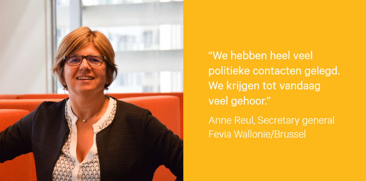 Anne: “Langs Waalse en Brusselse kant stonden ook wij permanent in contact met het kabinet van de ministers-presidenten, de minister van economie en volksgezondheid. Verder zijn wij via UWE vertegenwoordigd in het Waalse post-covid herstelplan ‘Get Up Wallonia!’. Door onze nauwe betrekking de laatste maanden in verschillende strategische groepen krijgen ook Fevia Wallonie en Brussel tot vandaag nog veel gehoor.”