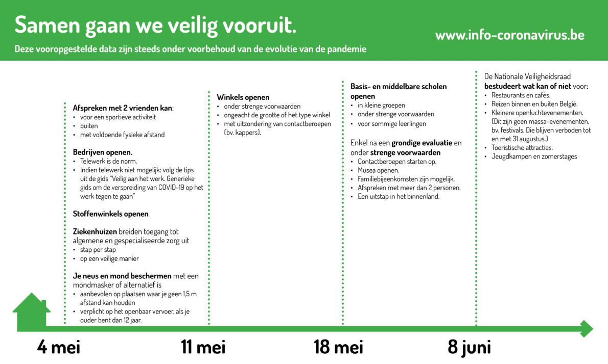 Tot en met 3 mei blijven de huidige maatregelen van kracht. Daarna zou België kunnen beginnen met de afbouw van de maatregelen, als de omstandigheden het toelaten. Sowieso blijven in alle fases volgende regels gelden: