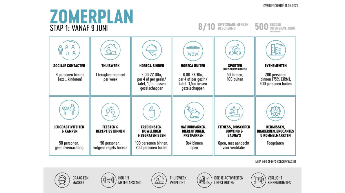 Heel wat positieve boodschappen op het overlegcomité vandaag dus, met duidelijke perspectieven voor heel wat sectoren, ondernemers, werknemers en burgers. Zo mag de horeca vanaf 9 juni ook binnen opnieuw mensen ontvangen, versoepelen de regels rond telewerk stapsgewijs en komen er ook perspectieven voor de heropening van onder andere de culturele sector, events en festivals.