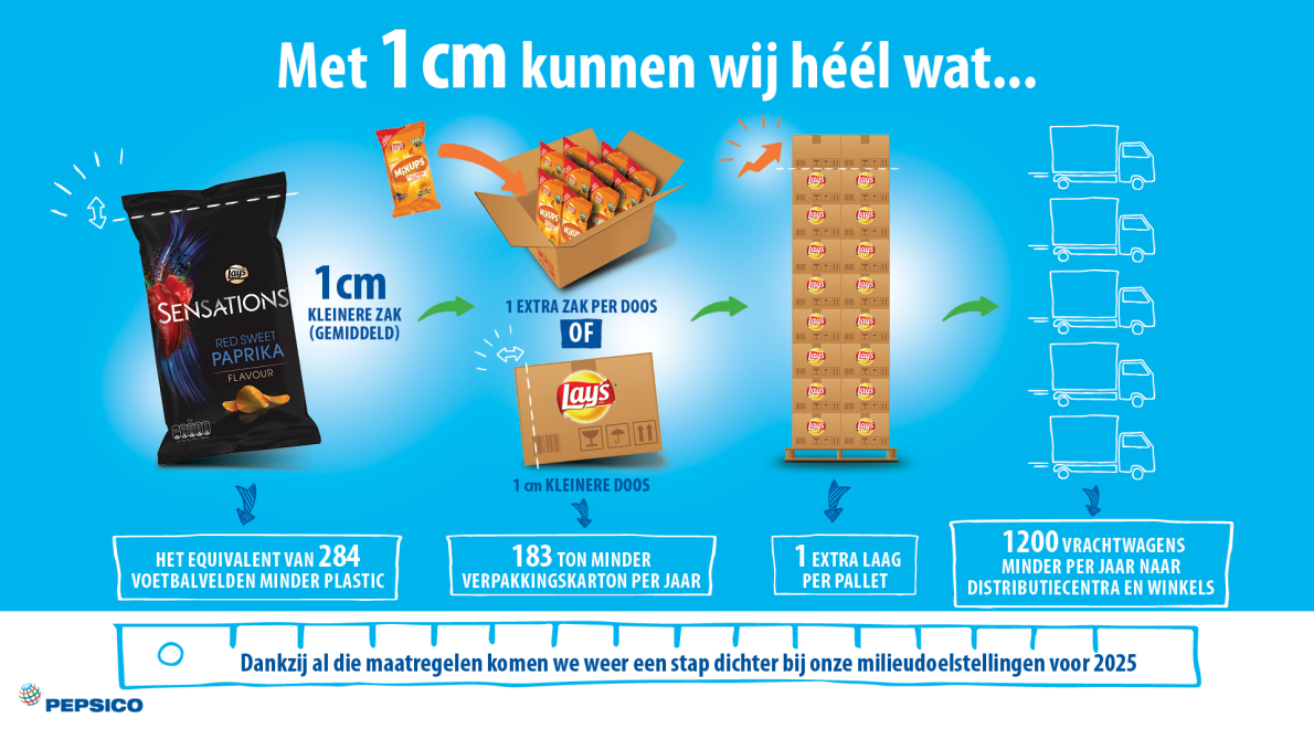 PepsiCo wil tegen 2025 haar verpakkingen verduurzamen, in lijn met het sectorengagement www.verpakkingen2025.be. Het R&D-team nam de uitdaging onder de loep, en met een vleugje creativiteit kwamen ze met kleine aanpassingen die een groot effect hebben. Hun innovatieve chips zakjes, kleinere verpakkingen en drankflessen met gerecycleerd materiaal leveren jaarlijks al een besparing op van 1255 vrachtwagenladingen!