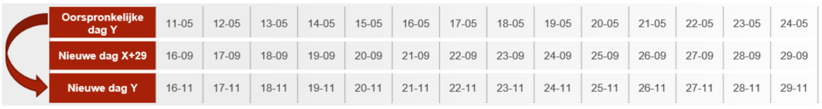 Uw nieuwe dag Y valt in de periode van 16 tot en met 29 november 2020. De nieuwe datum wordt bepaald in functie van de oorspronkelijk vastgelegde verkiezingsdatum. Als de verkiezingen initieel zouden doorgaan op bijvoorbeeld maandag 11 mei 2020, zullen zij nu dus op maandag 16 november 2020 moeten plaatsvinden. Voor ondernemingen waarvan de oorspronkelijke dag Y viel buiten de periode van 11 tot en met 24 mei 2020 (bijvoorbeeld omdat de procedure vertraging heeft opgelopen), bestaat een afwijkende regel.