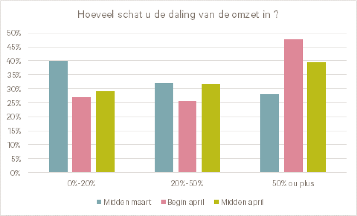En de cijfers vragen om toelichting! Het gemiddelde omzetverlies bedraagt immers ongeveer een derde in vergelijking met een normale periode. Natuurlijk zitten hierachter grote verschillen tussen bedrijven. Sommigen (een minderheid) kennen een zeer lage impact terwijl anderen hun omzet bijna volledig in rook zien opgaan. Het is ook een teken aan de wand dat het geschatte omzetverlies in de eerste enquête, uitgevoerd half maart, meestal minder dan 20% bedroeg, terwijl het verlies vanaf begin april werd geschat op meer dan 50%.