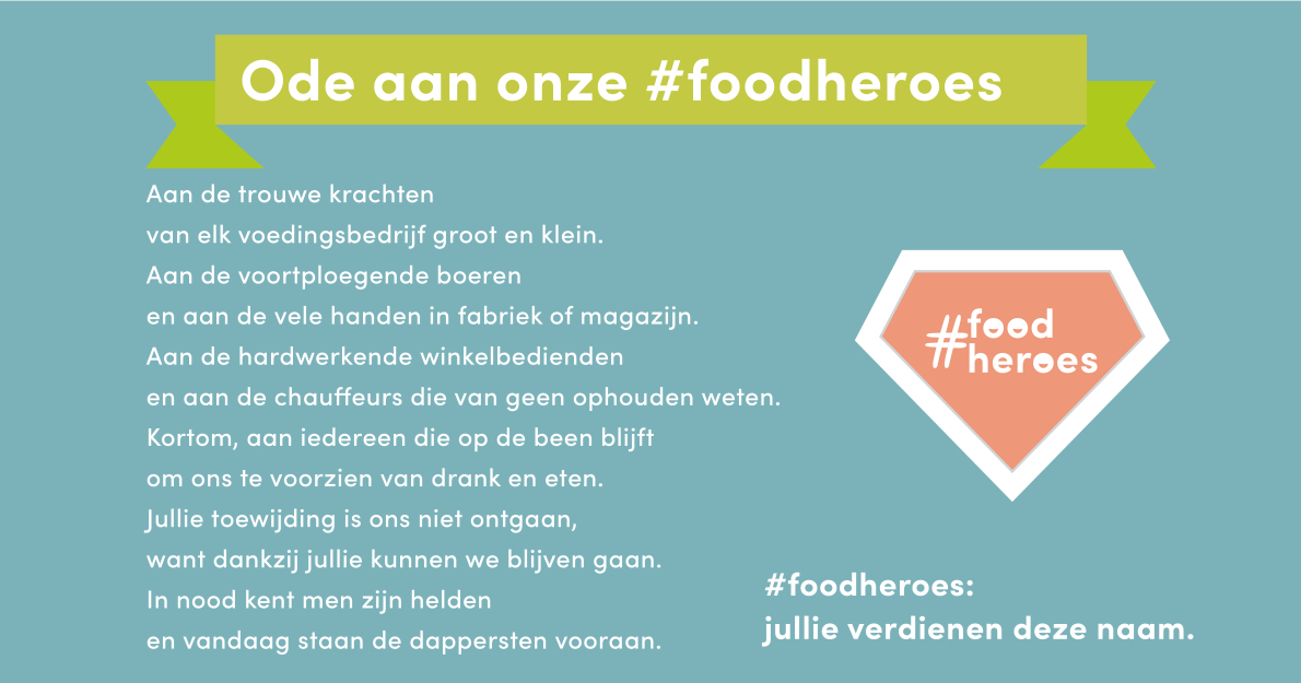 Voor heel wat Belgen die komende weken thuis zitten, zal voeding een troost zijn die ze maar al te graag delen via de sociale media. Wij willen hen aanmoedigen om daarbij ook eens te denken aan de helden die in moeilijke omstandigheden blijven doorwerken om die voeding te maken! Daarom gaan we alle Belgen – van de man in de straat tot onze politici - oproepen om de hashtag #FoodHeroes te gebruiken en een Like te geven voor onze helden.