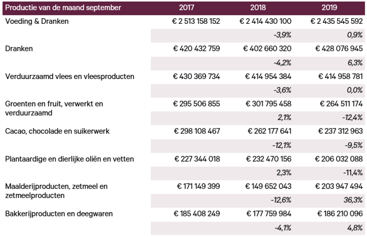 Door de industriële productiecijfers van september (bron: Statbel) te extrapoleren, lijkt de voedingsindustrie in 2019, na een vrij moeilijk 2018, een licht herstel van de activiteit te laten zien. De voedingsindustrie als geheel registreerde immers in september 2019 een gematigde productiestijging van net iets minder dan 1% in vergelijking met dezelfde maand een jaar geleden. Achter dit cijfer gaan echter, naar gelang de sector, verschillende realiteiten schuil.