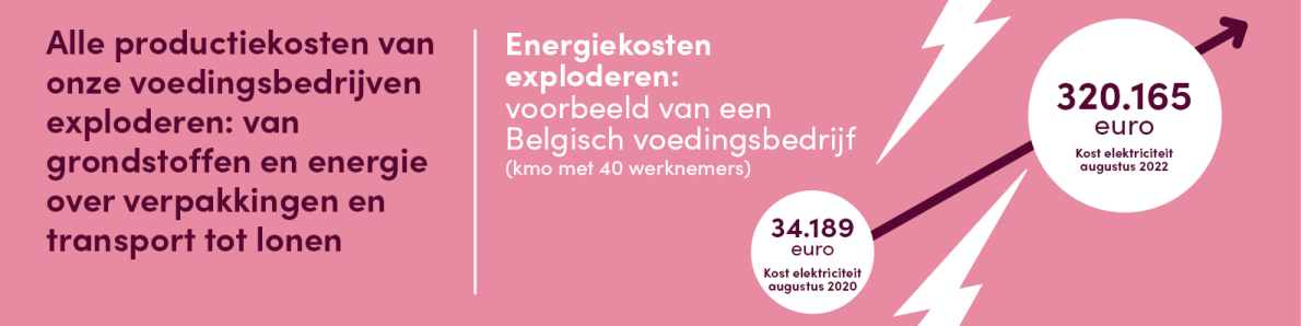 Onze voedingsbedrijven zien hun prijzen voor grondstoffen, verpakkingen en vervoer al twee jaar exponentieel stijgen. Bovendien zijn hun energiekosten de pan uit gerezen: 63% van de Belgische voedingsbedrijven zag zijn gas- en elektriciteitsrekening in 2022 meer dan verdubbelen. En voor 40% zijn ze meer dan verdrievoudigd.