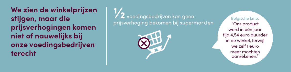 Voor een kwart van onze bedrijven werd hun verzoek om een prijsherziening afgewezen. En het resterende kwart kreeg zelfs geen antwoord of geen kans om te heronderhandelen. Toch merken veel producenten dat de prijs van hun producten in de winkels veel meer is gestegen dan wat zij aan verhoging hebben bekomen. Hier gaat dus iets fundamenteel mis!