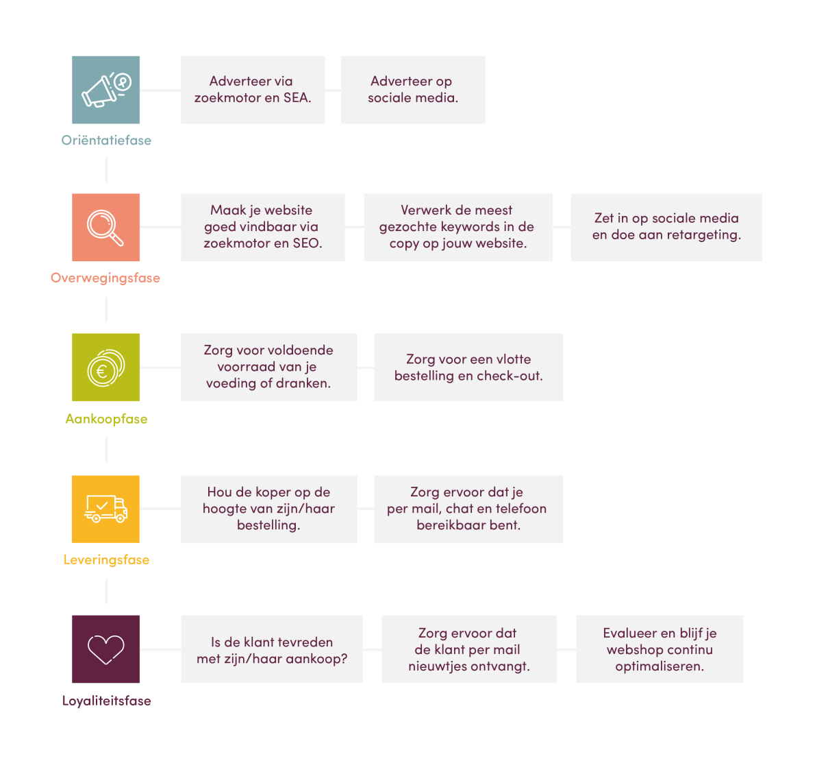Een “customer journey” is het pad dat iemand aflegt bij het kopen van een product of dienst. Met dit model weet je dus hoe een potentiële klant zich digitaal beweegt, zodat jij hier op kan inspelen. Een customer journey bevat 5 fasen: de oriëntatie-, overwegings-, aankoop-, leverings- en loyaliteitsfase.