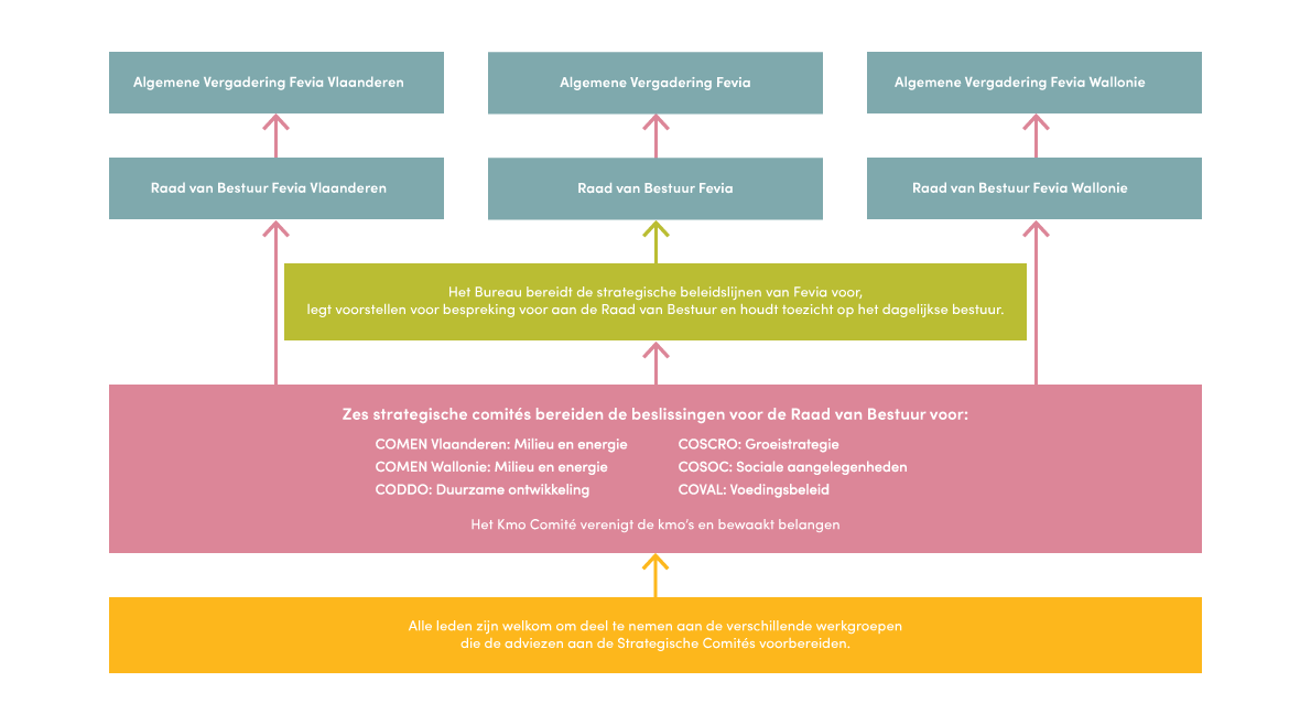 Fevia is er voor en door de leden, van kmo's tot multinationale bedrijven. Met inspraak op alle niveaus spelen leden een actieve en centrale rol in de Fevia-organisatie.