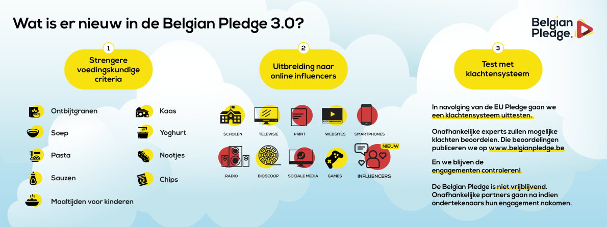 De Belgian Pledge is een initiatief van de Belgische voedingssector waarbij 52 voedingsbedrijven, handelaars, restaurantketens en cateraars zich vrijwillig engageren om hun marketing naar kinderen jonger dan 12 jaar te beperken en aan strikte criteria te onderwerpen. Fevia, Comeos en UBA lanceren nu de Belgian Pledge 3.0: een vernieuwd engagement dat de lat opnieuw hoger legt, met verstrengde voedingskundige criteria om te mogen adverteren naar kinderen, een uitbreiding naar online influencers en een test met een klachtensysteem. Met deze vernieuwde Belgian Pledge zet de voedingssector op eigen initiatief stappen vooruit en toont ze zich een verantwoordelijke partner in het streven naar gezondere voedingskeuzes.