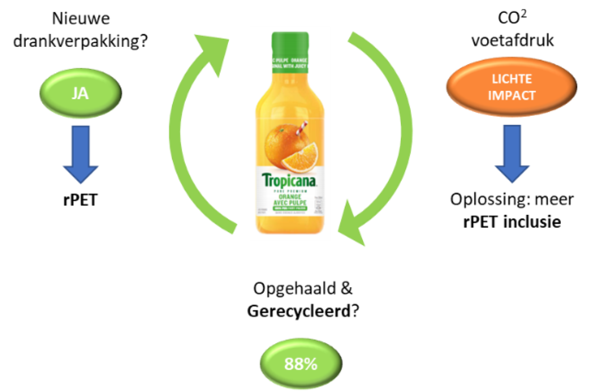 Tropicana streeft naar een circulaire economie. Daarom koos ze ervoor dat de verpakking van Tropicana uit PET bestaat (waarvan 50% rPET) van kartonnen verpakkingsproducent Elopack. Omdat de recyclagepercentages voor beide soorten verpakkingen vergelijkbaar zijn, kijkt PepsiCo verder naar de ecologische voetafdruk en de hernieuwbaarheid van de materialen.