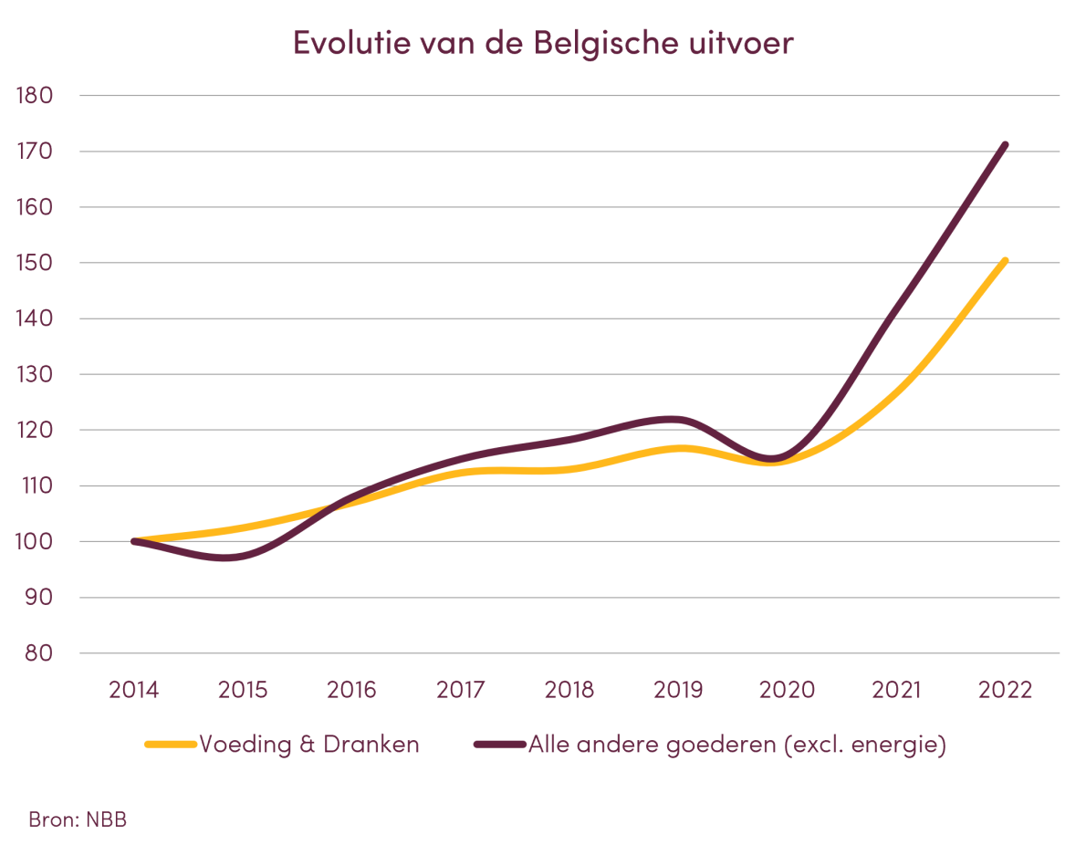 De uitvoer van voedingsmiddelen is goed voor iets meer dan een tiende van de totale uitvoer (exclusief energie) uit België. Terwijl tijdens de covid crisis van 2020 de uitvoer van voedingsmiddelen en dranken beter stand hield dan die van andere goederen, groeide de uitvoer van voedingsmiddelen de twee daaropvolgende jaren relatief minder.