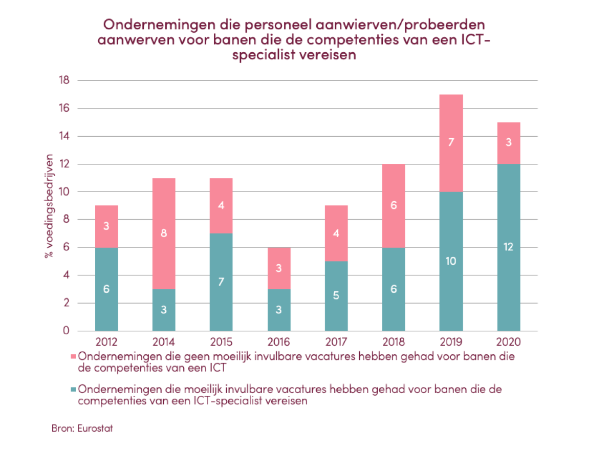 Tussen 2016 en 2019 steeg het aandeel van bedrijven uit de voedingsindustrie dat ICT-specialisten heeft proberen aan te werven/heeft aangeworven, van 6% naar 18%. In 2020 daalde dit percentage opnieuw lichtjes (15%).