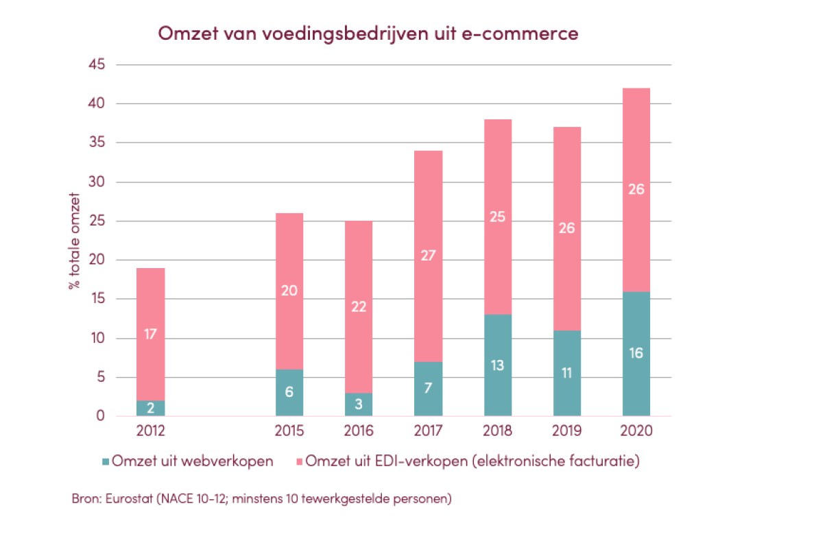 Het aandeel van de omzet uit e-commerce van Belgische voedingsbedrijven overschreed voor de eerste keer de grens van 40% en bedroeg in 2020 42% (tegenover 36% in 2019). 61% van de omzet uit e-commerce wordt gegenereerd door transacties van het EDI-type (Electronic Data Interchange) terwijl 39% wordt gegenereerd door de verkoop via een klassieke website. Het is trouwens dat deel dat de sterkste stijging heeft gekend (+4 pp).