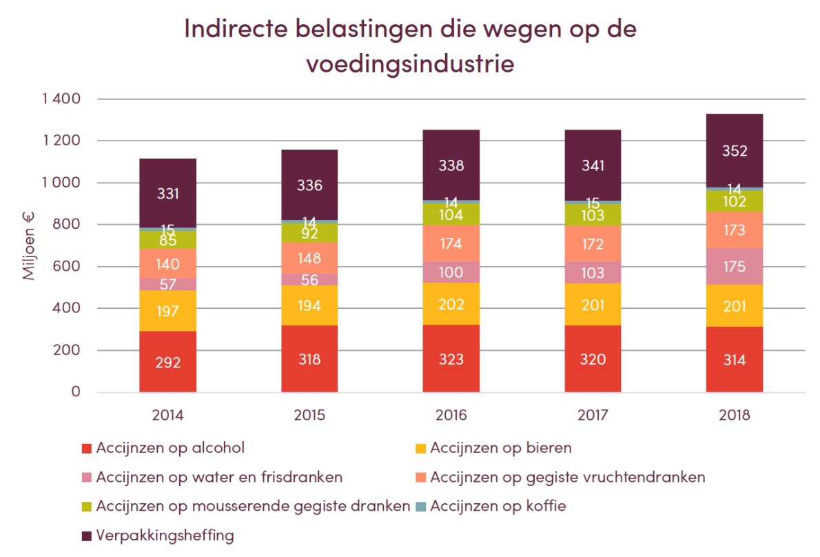 De indirecte belastingen wegen heel zwaar op de voedingsindustrie, en specifiek voor de productie van dranken, met een totaal van meer dan 1,3 miljard euro in 2018. De accijnzen op alcohol brachten 314 miljoen euro op, bier 201 miljoen euro en drinkwater en frisdranken 175 miljoen euro. Rekening houdende dat, als gevolg van een taksverhoging, de accijnzen voor drinkwater en frisdranken in 2016 een forse stijging kende.